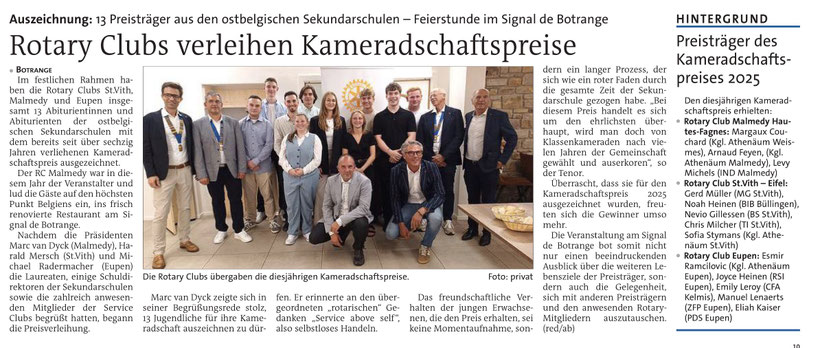 Gewählt werden die Preisträger durch ihre Klassenkameraden im Abiturjahr für die Werte die Freundschaft ausmachen: Hilfsbereitschaft, Teamgeist, Verlässlichkeit, Höflichkeit, Respekt und Tolleranz. Werte die auch das wichtige Fundament für die Zusammenarbeit innerhalb der Rotary Clubs sind.